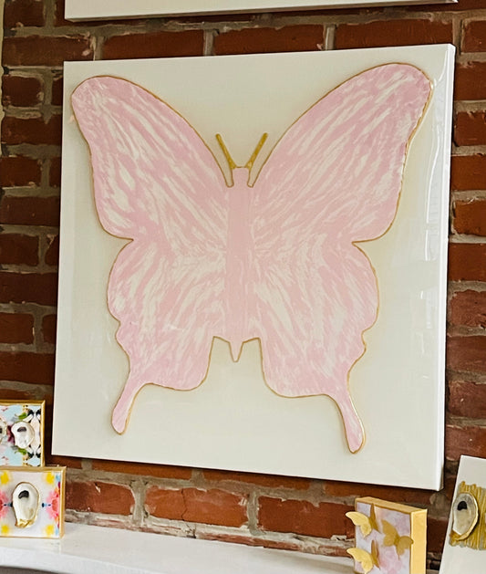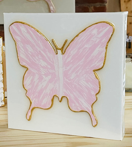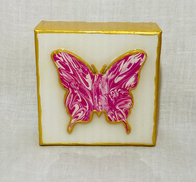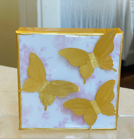 5 Gold Butterflies on Pink Floral 8x8 Canvas