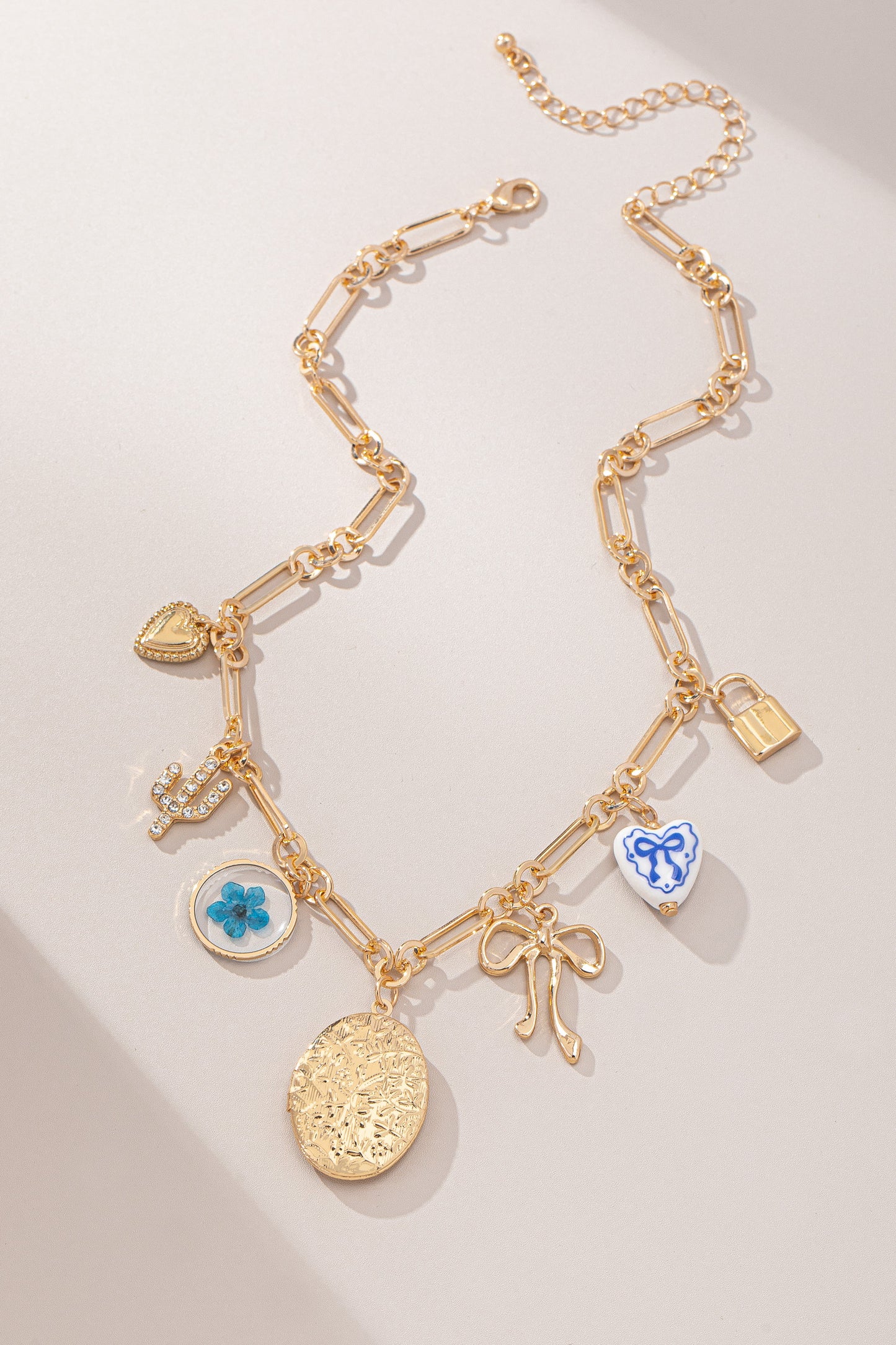 A whimsical mix of vintage elegance and playful modern accents, this charm necklace is a conversation piece. Featuring a gold-plated chain adorned with a variety of detailed charms, including a blue dried flower disk, ceramic heart with bow design, a padlock, a cactus with rhinestones, and a textured oval locket pendant. Each charm is uniquely crafted to add a distinct character to your look.