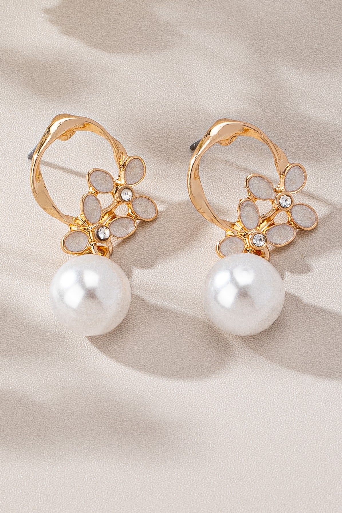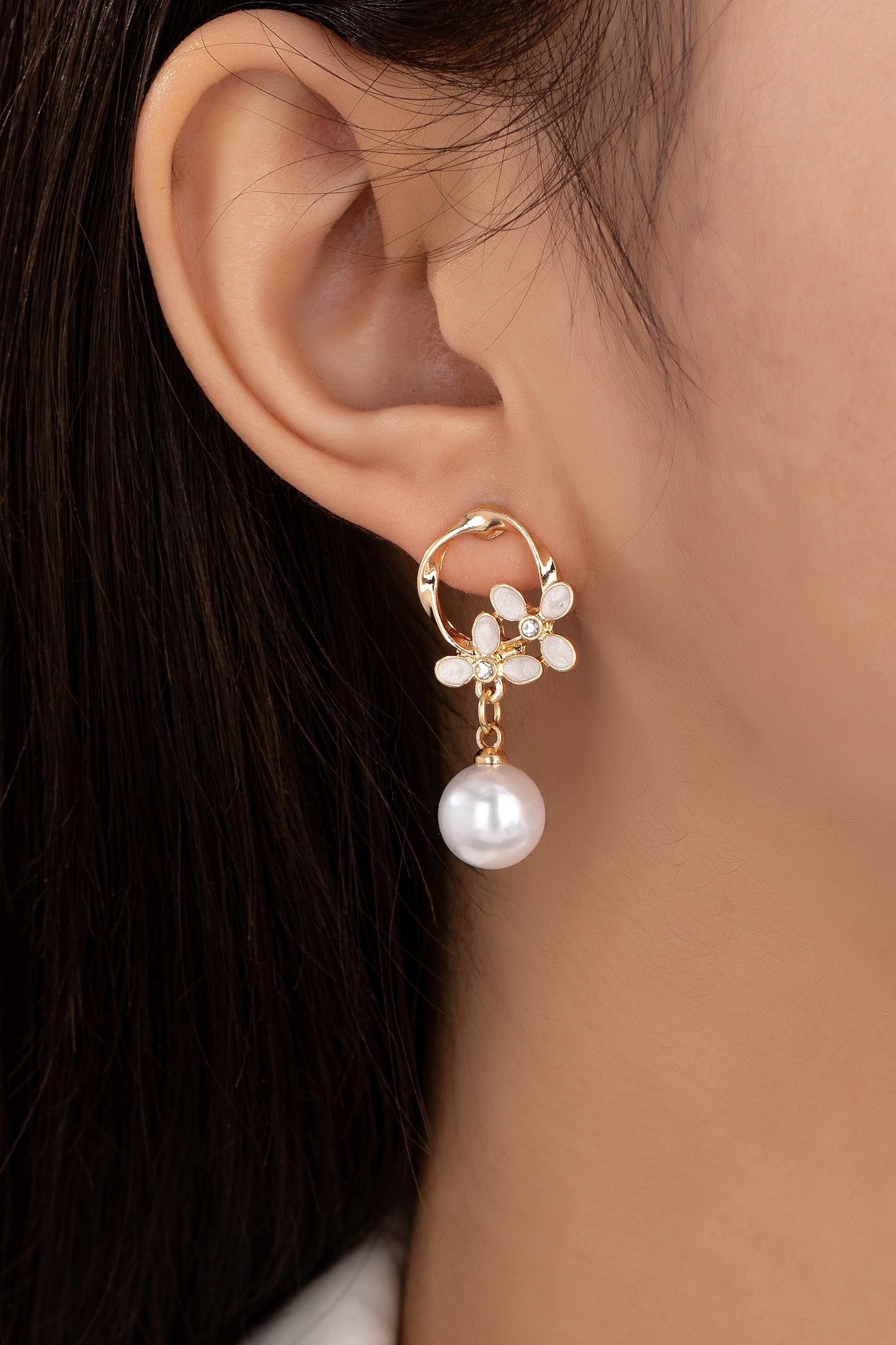 Exude elegance with these Floral Pear Drop Earrings. Featuring a delicate gold-tone floral design with enamel peals and sparkling crystal accents, these earrings are adorned with a lustrous pear drop for a timeless and sophisticated look. The hammered gold detailing adds a touch of modern artistry to this classic design.