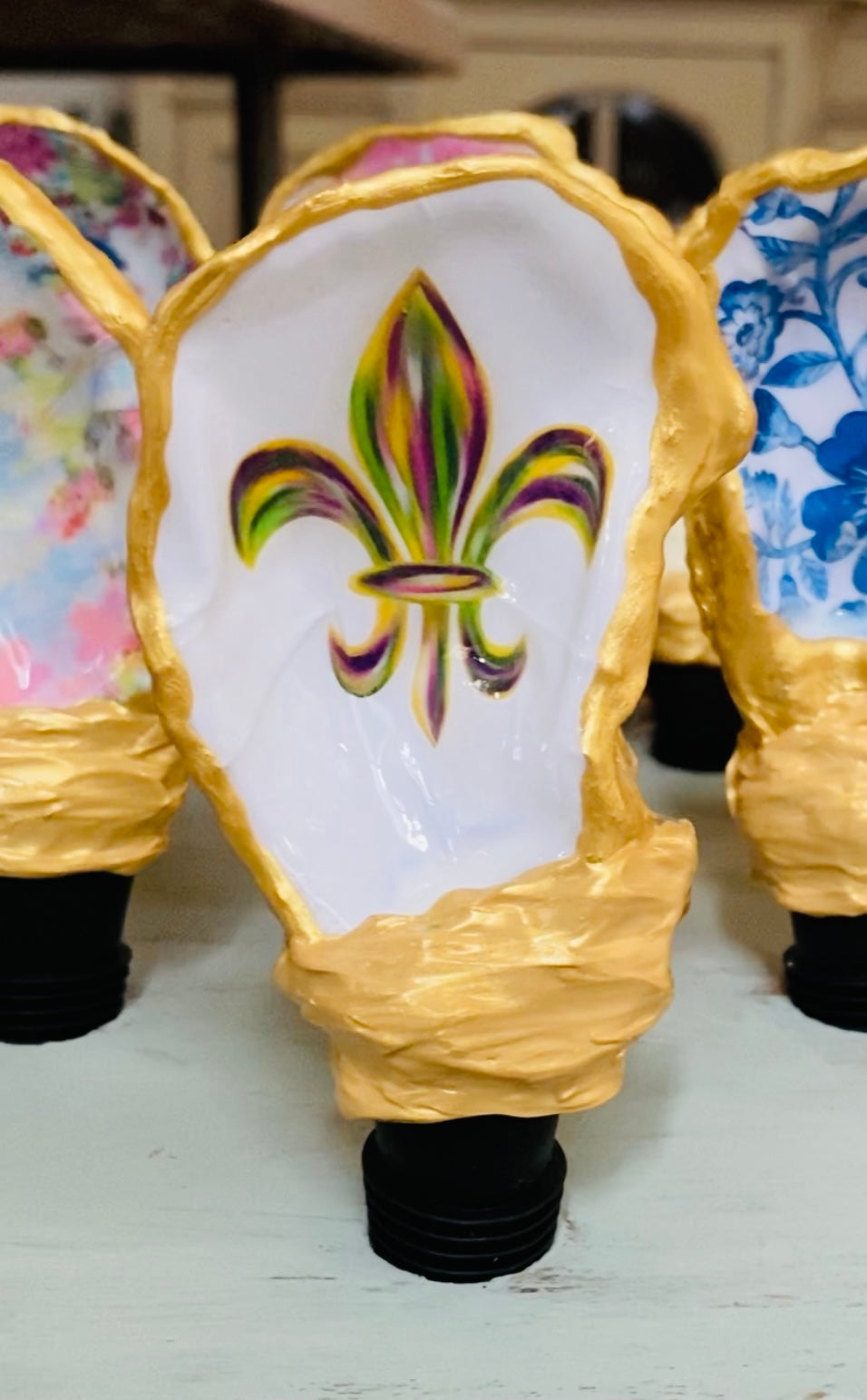 Fleur de Lis Oyster Wine Stopper. Each wine stopper is unique due to each oyster is different. Handmade in New Orleans.