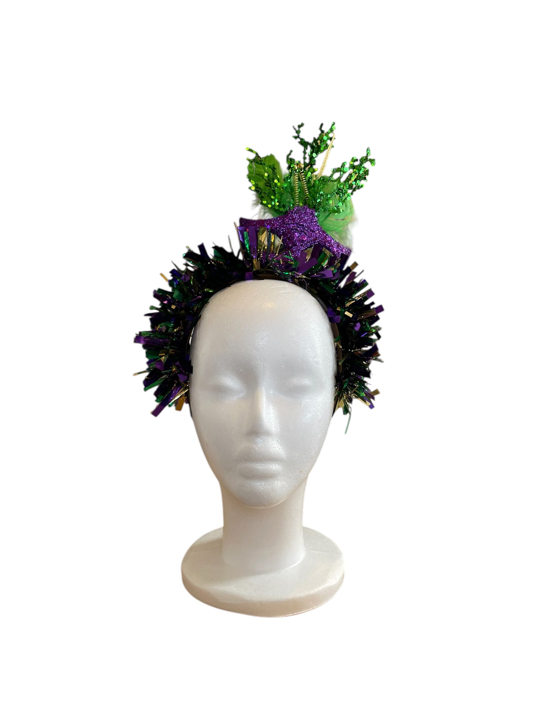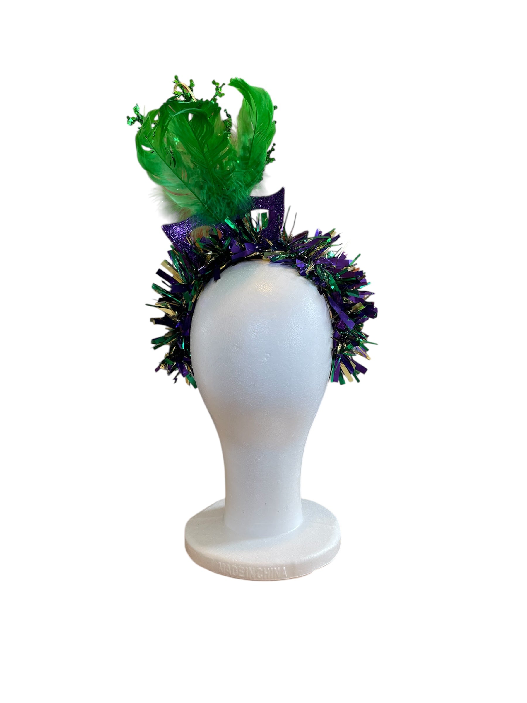 Fun and festive Mardi Gras headband with mask detail and feathers to add to the fun!