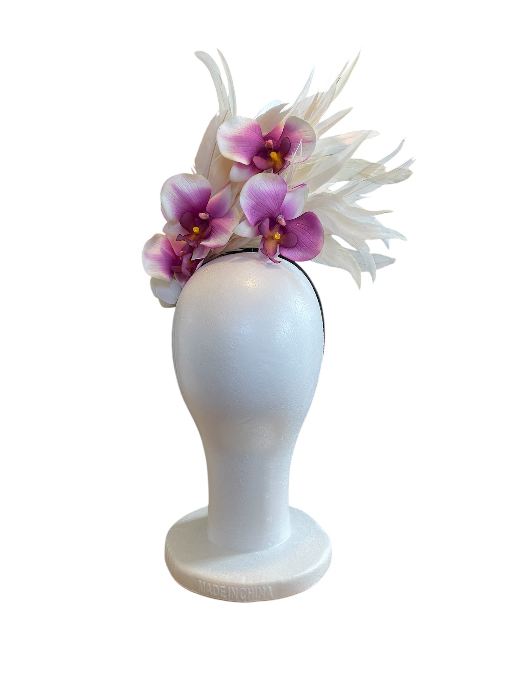 Headpiece featuring white and purple orchid with accent ivory feathers!