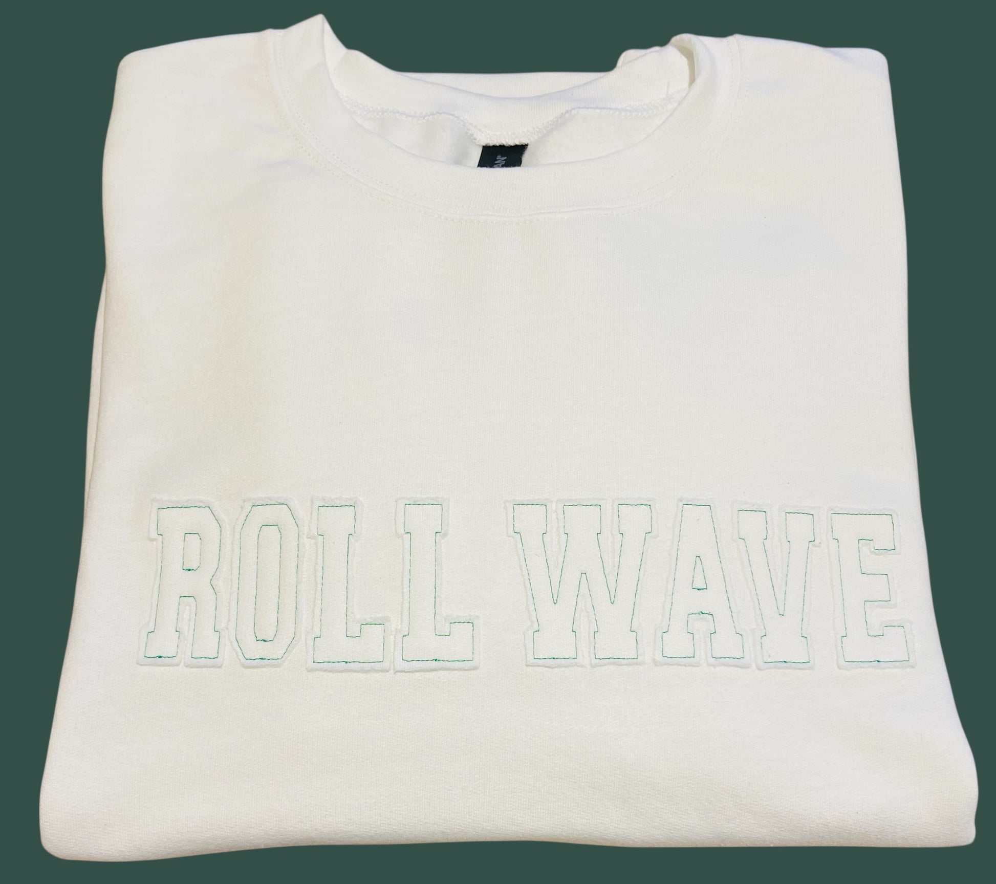 ROLL WAVE Embroidered Sweatshirt available in White with Green Thread. Made in New Orleans. Available in X-Small, Small, Medium, Large, X-Large and XX-Large.