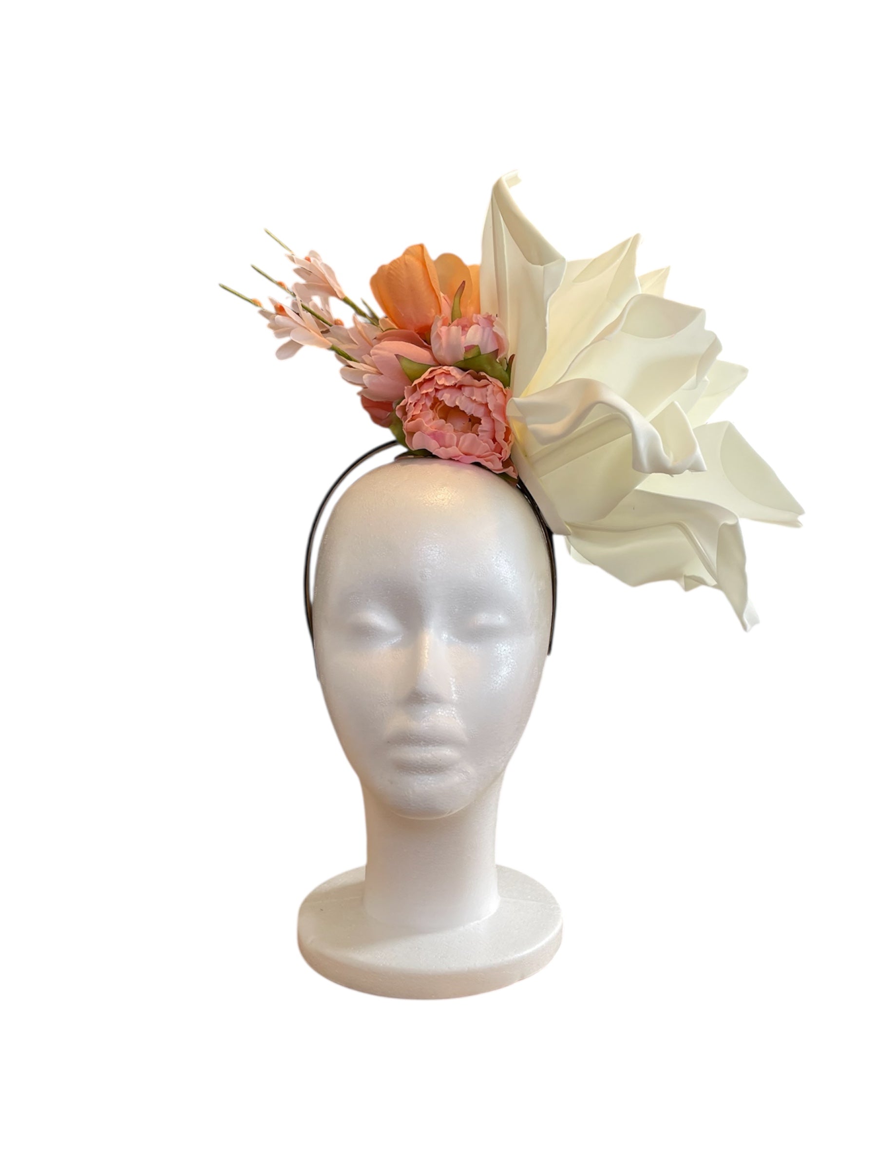 Beautiful headpiece featuring a lightweight, large white/ivory flower. The large flower is complimented by smaller orange and pink flowers!