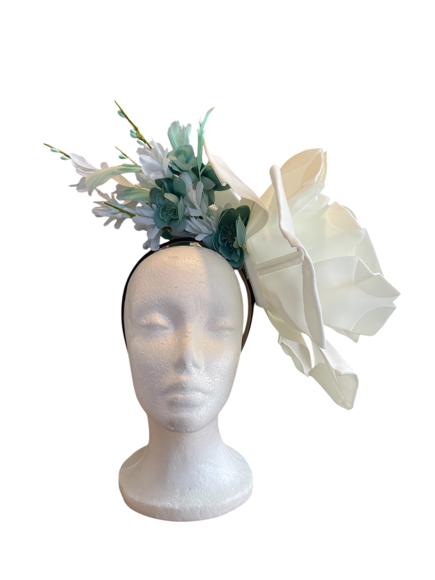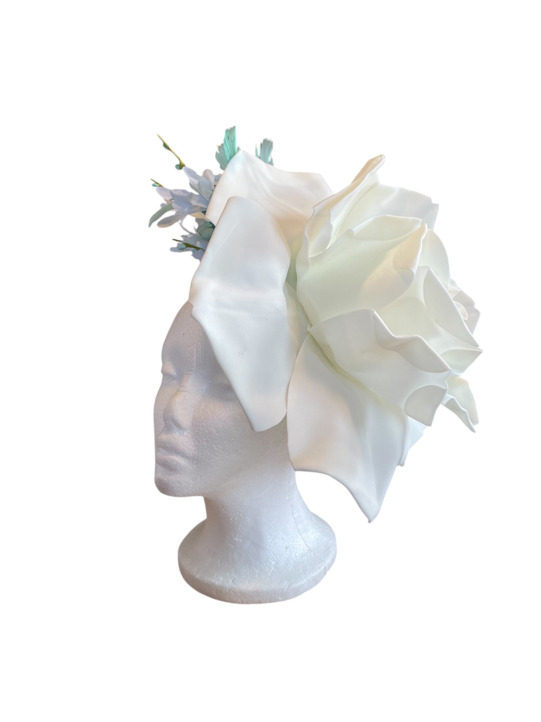 Beautiful white flower headpiece featuring blue and white accent flowers. Perfect for brunch!